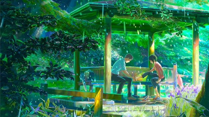 Nel caso specifico, infatti, la vicenda racconta l'incontro fra Takao, studente che salta le lezioni per dedicarsi al disegno delle scarpe, e una misteriosa donna più grande, Yukino, pure afflitta da un silenzioso "male di vivere". Fra i due nascerà una silenziosa solidarietà destinata a trovare la sua compiutezza solo nel giardino dove avvengono gli incontri, ma che poi il mondo "di fuori" metterà alla prova.