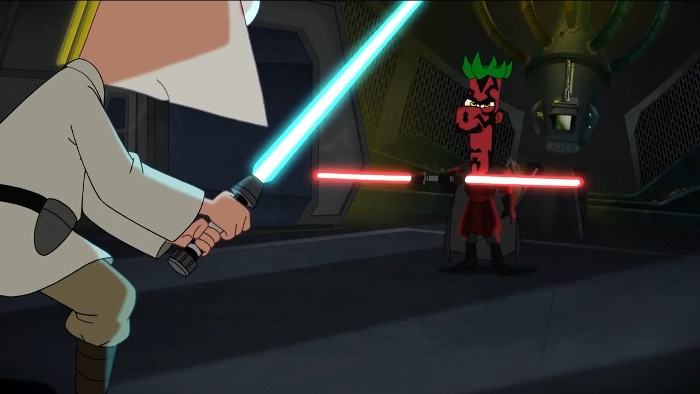 Gli eventi ben presto precipitano fino all'irresistibile momento in cui Ferb viene posseduto dal Lato Oscuro e Darthmaul-izzato :-))
